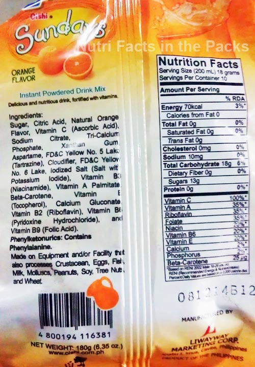 Sundays Orange Flavor by Oishi (Instant Powedered Drink Mix), back part. Here goes the nutrition facts that you can get from this orange flavored drink mix under Oishi.